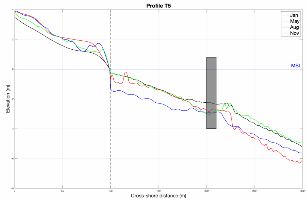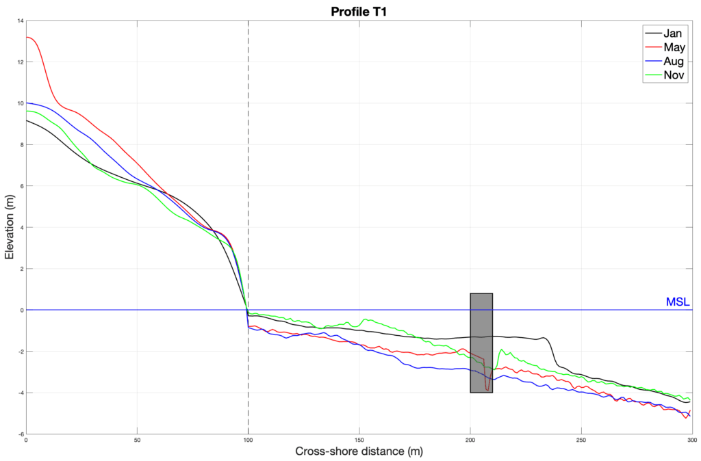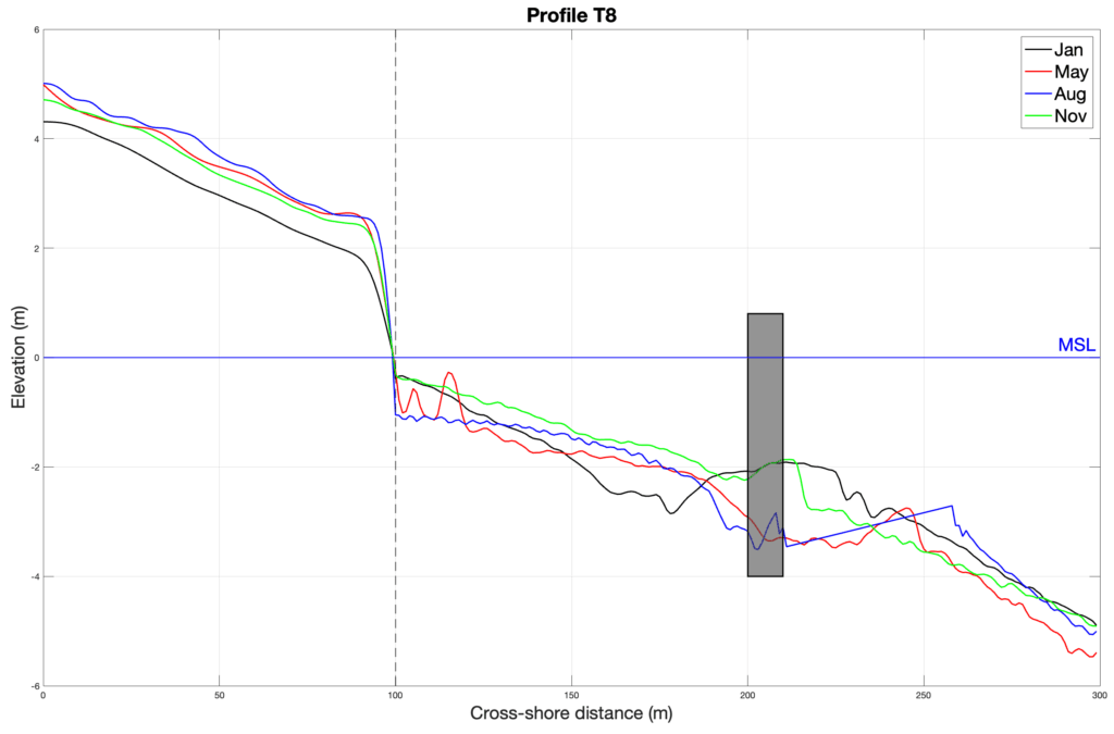 Figure 10: Examples of seasonal beach profiles derived from four field surveys. Positive elevations represent subaerial beach morphology, while negative elevations indicate the nearshore bathymetry relative to mean sea level (MSL; blue line). The dashed vertical line marks the shoreline position at approximately 100 m cross-shore distance. The shaded grey rectangle denotes the location of the offshore breakwater, which has a crest elevation of +0.8 m above MSL and a total structure length of 100 m.