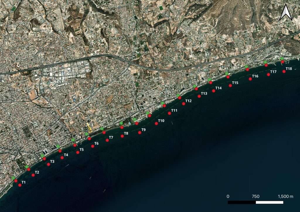 As part of our efforts to understand the regional coastal dynamics of Limassol, we conduct high-resolution elevation surveys using the MATRICE 300 RTK drone, which offers a vertical accuracy of ±0.1 m (Figure 8) across 18-selected profiles, spanning the commercial coastline of Limassol (Figure 9). These drone flights cover the area from the intertidal beach zone up to the natural dune/cliff or built backbone, capturing detailed elevation models essential for monitoring shoreline evolution, erosion patterns, and critical coastal features.